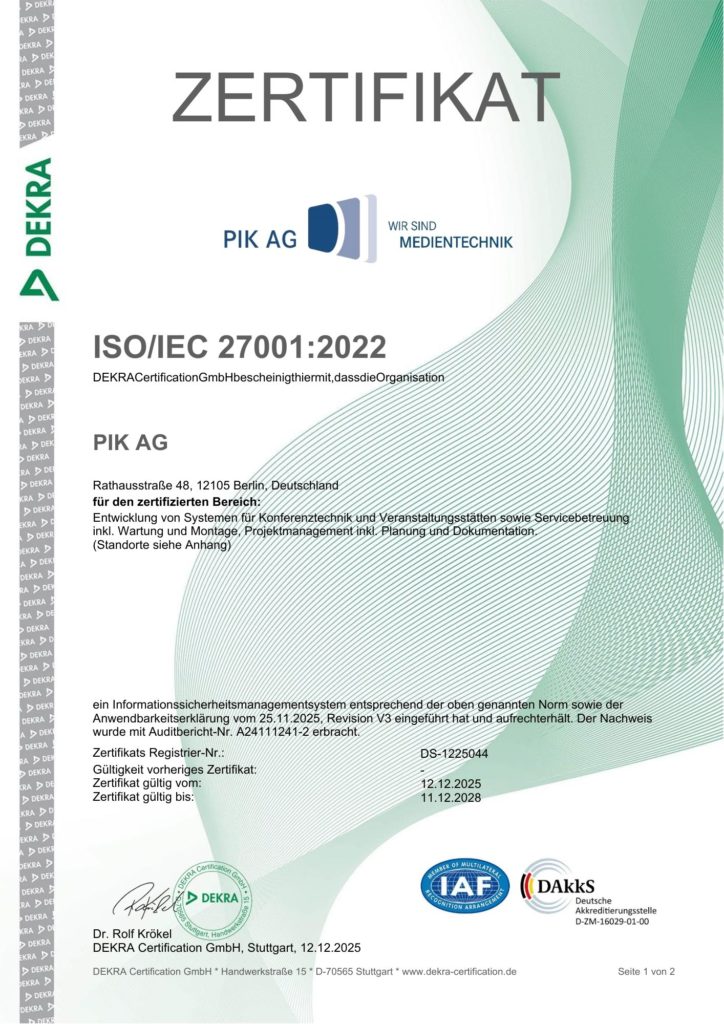 Die nächste Rezertifizierung ist für 2028 vorgesehen. Neben der Zertifizierung nach ISO/IEC 27001:2022 ist die PIK AG ebenfalls nach DIN EN ISO 9001 zertifiziert.